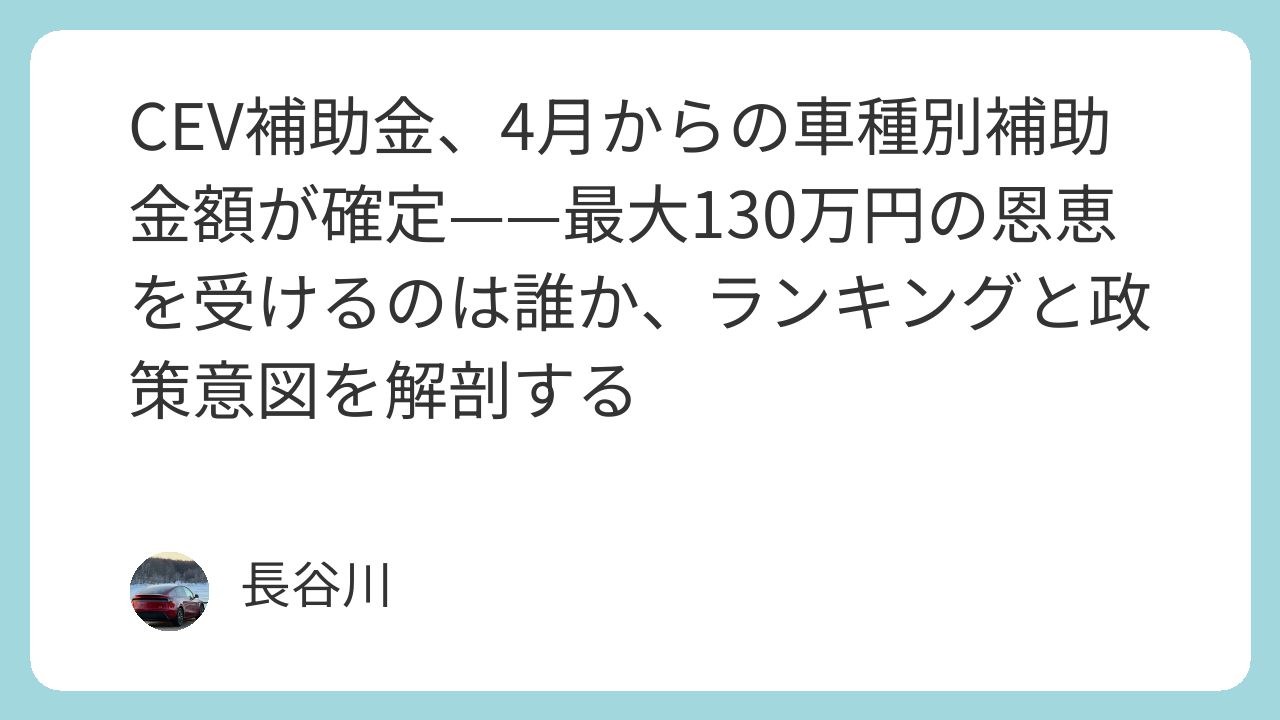 今日の発表は「4月1日以降の車種別確定額」だ。制度の大枠(最大130万円への増額)は2025年末にすでに決まっており、今回は「具体的にいくらもらえるか」が初めて確定した。