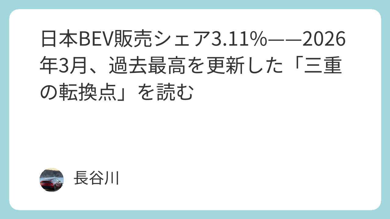 2026年3月は、日本のBEV市場が「助走フェーズ」から「離陸フェーズ」に移行した最初の所見を示した月になるかもしれない。ただし離陸が順調に続くかどうかは、今後3か月のデータが証明する。