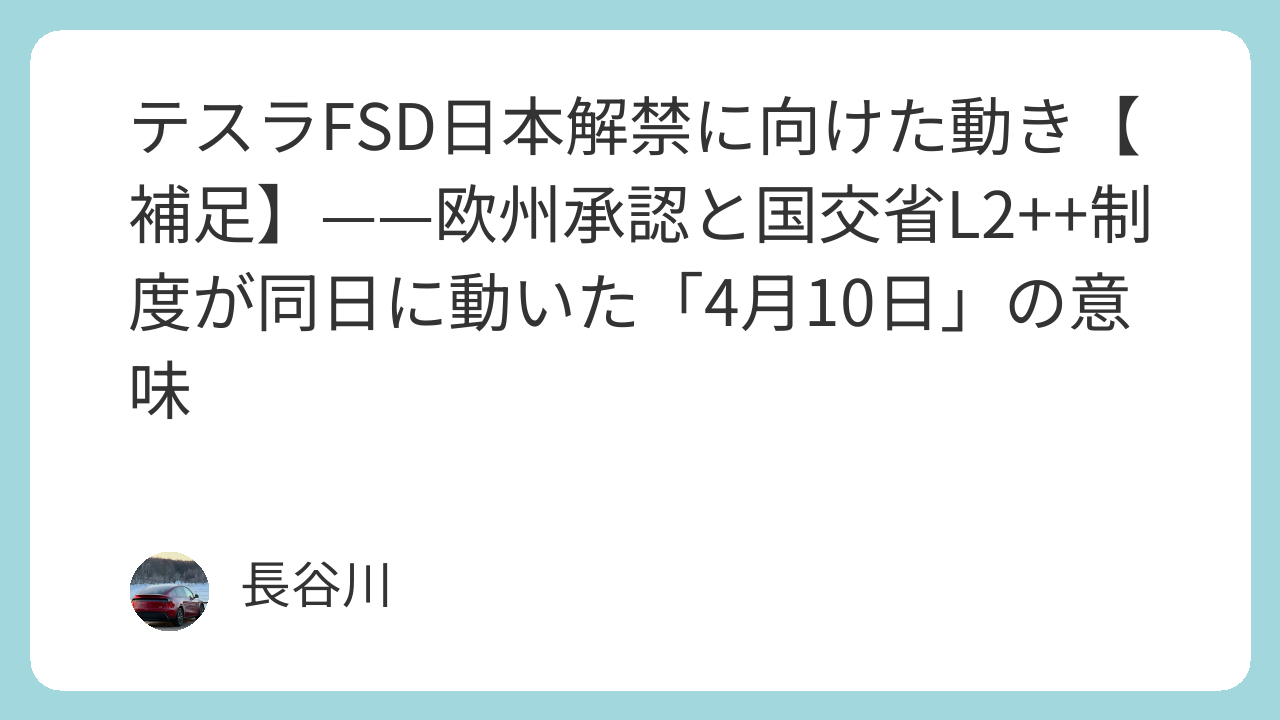 テスラFSD日本解禁に向けた動き【補足】——欧州承認と国交省L2++制度が同日に動いた「4月10日」の意味
