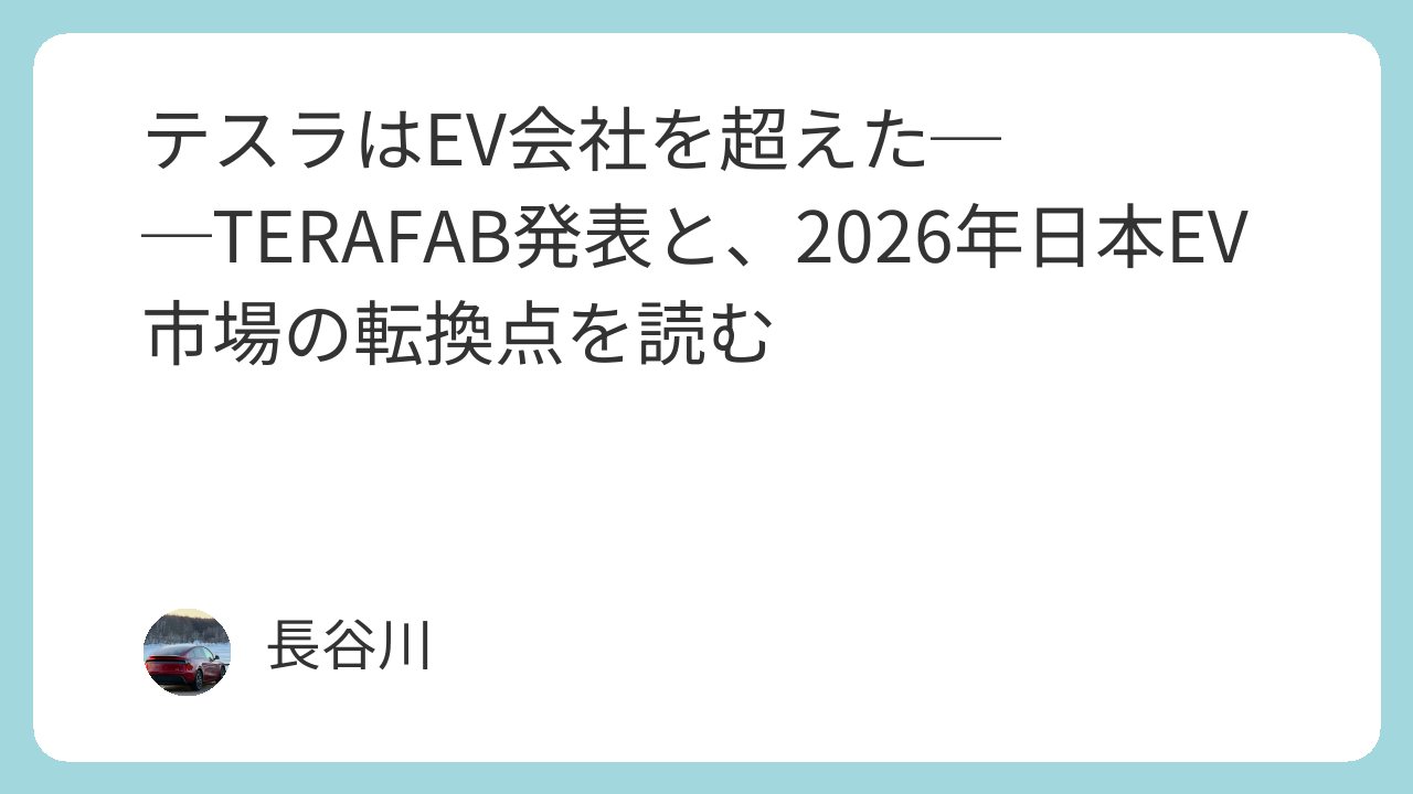今乗っているModel 3・YがFSD対応車両として進化し、その頭脳をTERAFABが支える——この壮大なバックストーリーを持つ車に乗っているという感覚は、「いいEVを持っている」という次元を大きく超えている。